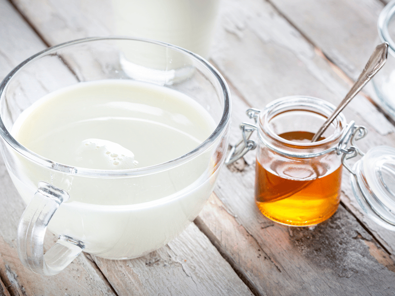 - Faites chauffer une tasse de miel et ajoutez 2 cuillères à soupe de lait entier chaud.