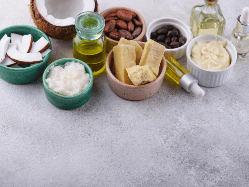 - Ajouter 15 g de beurre de cacao, l’huile de noix de coco et la cire d’abeille dans une casserole en acier inoxydable à fond épais et mélanger à feu doux.